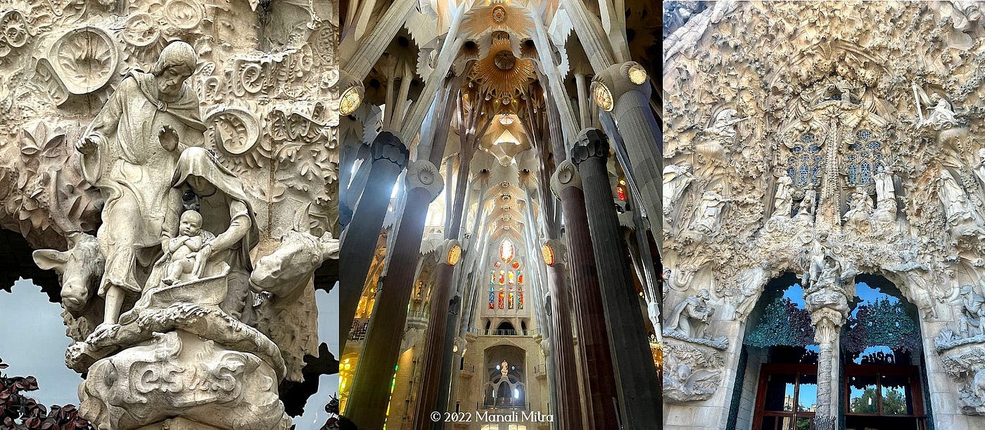 As I stepped onto the nativity façade, all my reservations dissipated. The scale and vibrancy of the interior are absolutely breathtaking! Columns, resembling the trees, ascended towards the ceiling, branching out like a majestic forest. The grand geometric stars were punctuated by open hyperboloids that absorbed and diffused light, creating an ethereal canopy reminiscent of the celestial realm. Sunlight filtered through stained-glass windows, painting the stone surfaces with a stunning palette of greens, blues, yellows, and reds, casting ever-shifting patterns and illuming intricate carvings.